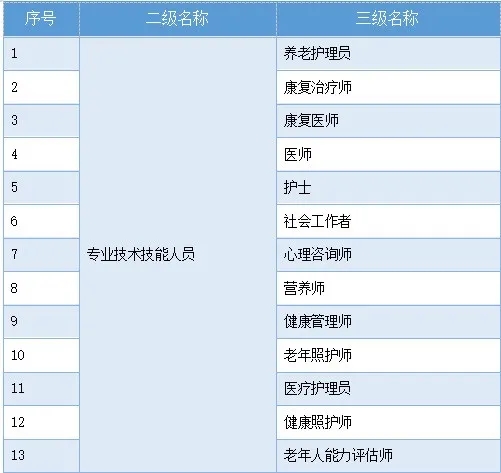 2020年7月,人社部、市場監(jiān)管總局、國家統(tǒng)計局發(fā)布了9個新職業(yè),其中包括“老年人能力評估師”。根據(jù)人社部對新發(fā)布職業(yè)的介紹,老年人能力評估師是“為有需求的老年人提供生活活動能力、認(rèn)知能力、精神狀態(tài)等健康狀況測量與評估的人員”。至此,包括醫(yī)護人員在內(nèi),我國共有13個與養(yǎng)老服務(wù)相關(guān)的人才資質(zhì)。